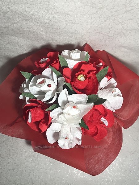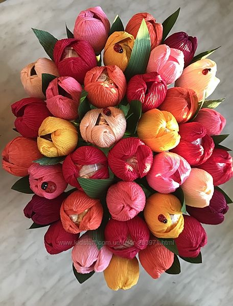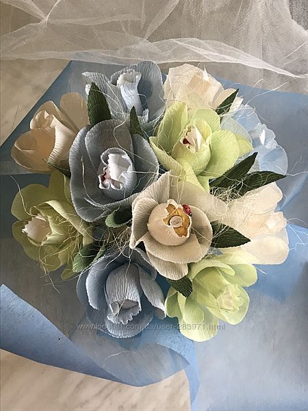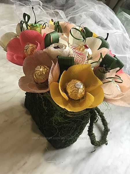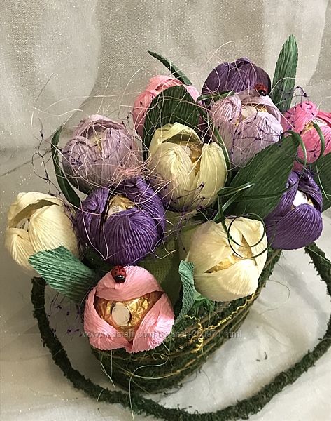 Букеты из конфет – это живописные съедобные творения, которые не только красивы, но и вкусны. Предлагаю сладкие подарки: отдельные цветы-конфеты, мини-букеты, композиции средних и больших размеров.С помощью таких букетов можно оформить праздничный стол, свадьбу, добавить к основному подарку, прикрепить к бутылке шампанского... …просто подарить как маленький комплимент.
