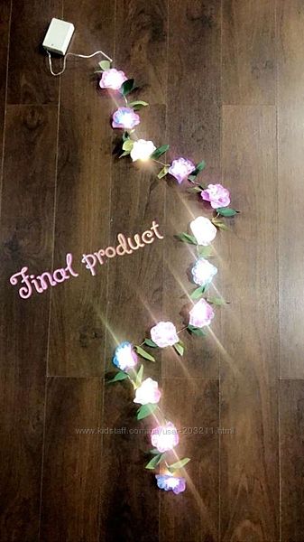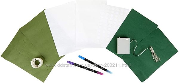 В наборе: 13 LED ламп (1.5 метра), заготовки для листьев и цветов, два двойных маркера, клей, инструкция.