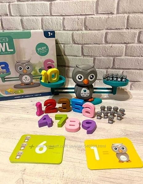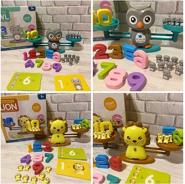 Развивающая игра Математические весы-балансир Это набор для веселого изучения цветов, цифр, понятия массы и размеров ! В комплекте: - кошечка -весы с двумя чашами - маленькие - гирьки - 19 шт - цифры - от 1 до 10 - 30 двухсторонних карточек с заданиями разного уровня сложности