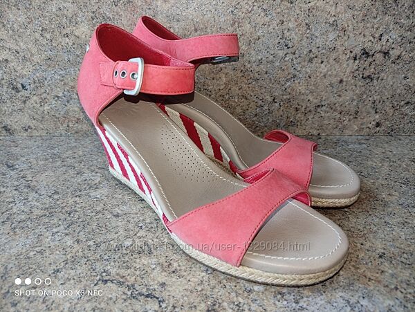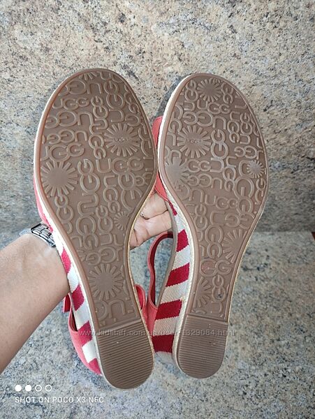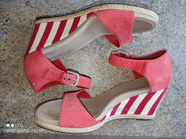 Ugg Atasha Stripe Women`s Wedge SandalsБомбезные босоножки кораллового цвета на танкетке из натуральной кожи - нубука. Бренд Ugg.