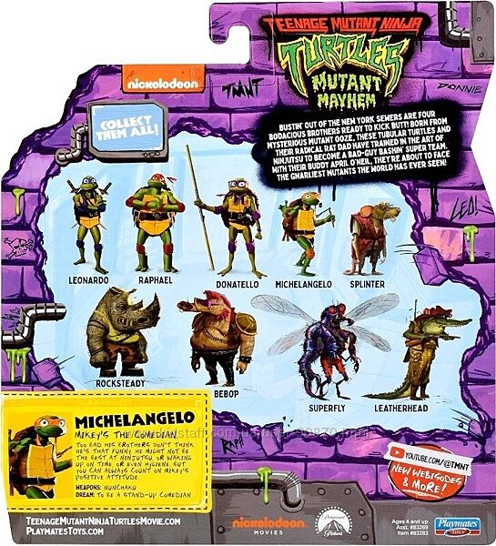 УПАКОВКА ДЛЯ ФІЛЬМУ: Майкі постачається в блістерній упаковці з яскравими яскравими деталями, яка включає в себе фірмовий знак TMNT Mutant Mayhem.