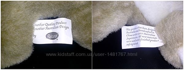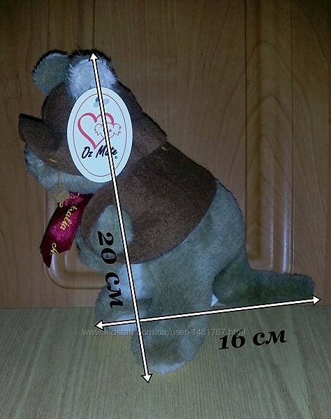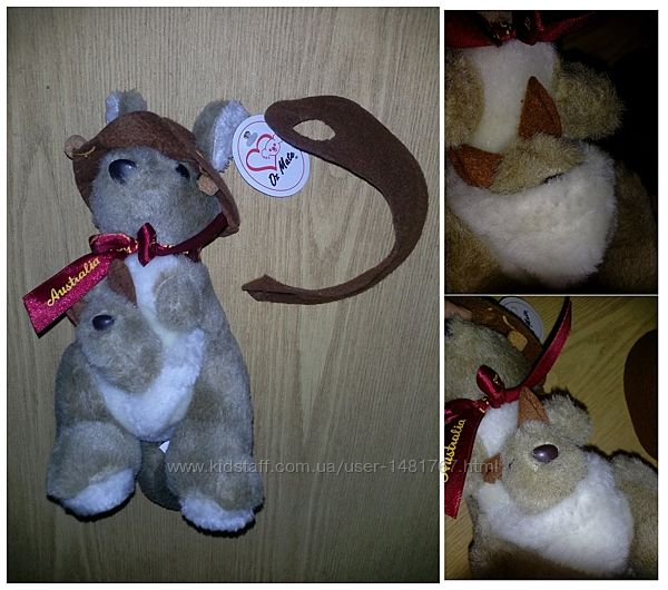 У игрушки снимается жилетка, шляпка и малыш кенгурёнок пришиты стежком. Кенгурёнка можно приподнять или засунуть в сумку мамы.