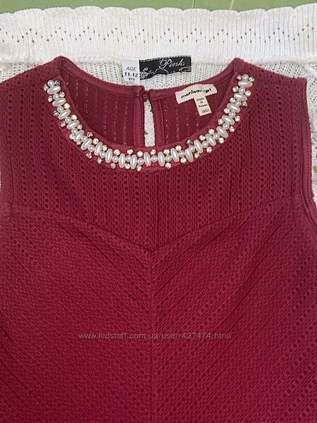 Тепле трикотажне платтячко низ на підкладці в комплекті з ажурним болеро. Верх платтячка оздоблений перлинками та камінцями. Пише на вік 12 років. Підійде на 9-12 років в залежності від росту.Заміри: ширина під пахами 36см, ширина в поясі 34см, довжина 75см.