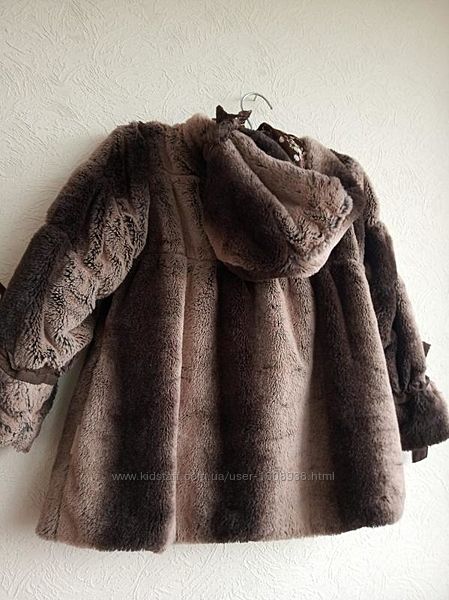 Детская пальто под шиншиллу. На осенне-весенний сезон. Украшена бантами на рукавах , капюшоне и впереди на шее. Застегивается на кнопки. Размер 5-8 лет.
