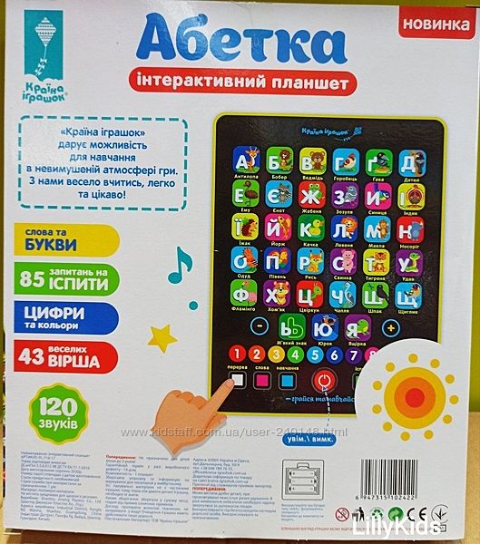 Інтерактивний планшет Абетка PL-719-17 на укр.мові, Країна іграшокЗа допомогою інтерактивного планшету у формі гри ваша дитина вивчить букви українського алфавіту, назви тварин або птахів, цифри й кольори.