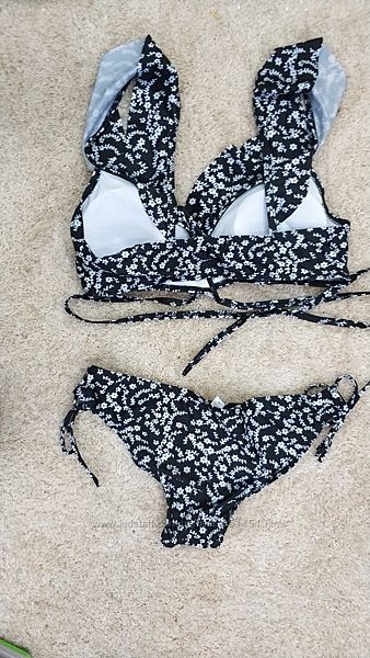 Красивый купальник черный в мелкий белый цветок Реальные фото выставлены. Доставка Новой почтой 1-3 дня.Очень нежно смотрится, треугольный верх с воланами по плечам и поролоновыми вставками, завязки спереди - можно отрегулировать объем, аккуратные плавки на завязках, передняя часть полностью на подкладке.