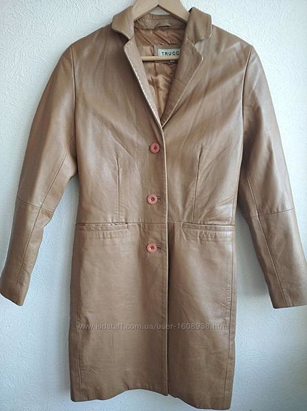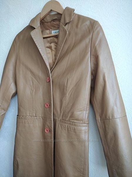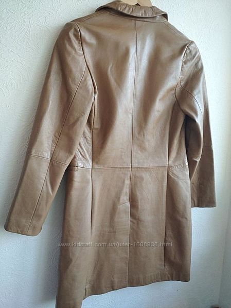 Кожаный тренч. Кожа мягкая, лайковая. На пуговицах. Впереди карманы, сзади небольшая шлица.. ЗАМЕРЫ: ПОГ 45 см, ПОТ 41 см, Длина рукава 61 см, Высота 89 см, Плечо 11 см, ширина в плечах 38 см. Состав: 100% натуральная кожа Доставка: Оплата на карту Приват банка, отправляю УкрПочтой, Новой почтой, justin почтой. Возможен наложенный платеж по предварительному авансу.