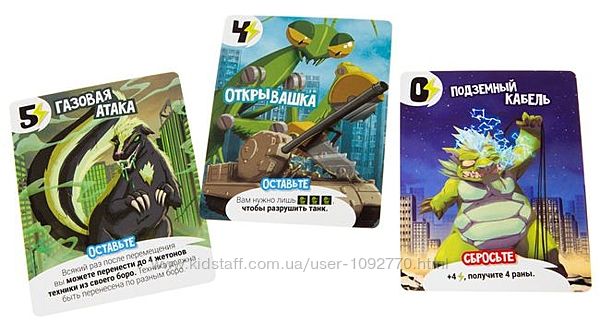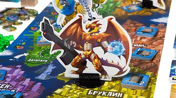 В коробке: 66 карт, 46 жетонов эффектов, 45 жетонов зданий/техники, 8 кубиков, 6 картонных фигурок, 6 пластиковых подставок, 6 планшетов монстров, кубы энергии, поле Нью-Йорка, правила игры.