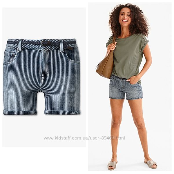 Джинсовые шорты в полоску Denim, с узким плетёным поясом, пояс с петлями для ремня, пуговицей и молнией, 5 карманов, спереди и сзади лёгкие потёртости. Полоски придают этим повседневным джинсовым шортам в классическом стиле характерный морской стиль, р.44евр(46FR), состав: 96% хлопок, 4% эластан, ткань тянется. Цена: 550 грн.