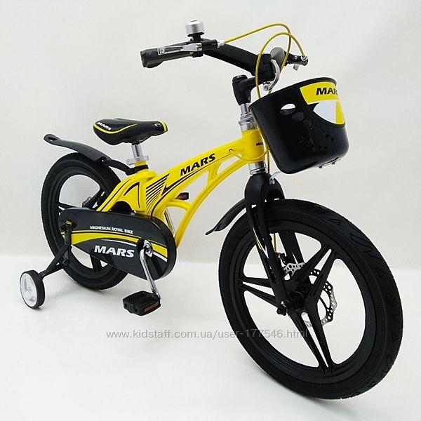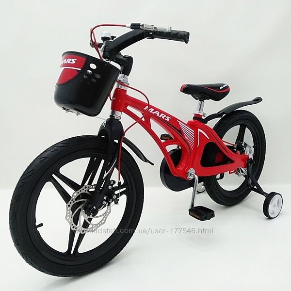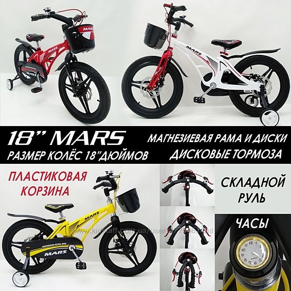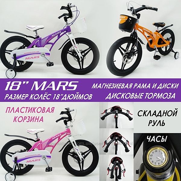 бесплатная доставкаМагнезиевый Велосипед «MARS-18» оснащен передним и задним дисковыми тормозами, магнезиевым складным рулем с вмонтированными в нем часами. Также в комплектацию входят: передняя корзина, звонок, переднее и заднее пластиковые крылья, подножкой и тренировочными колесами.Размер коробки: 85х18х42см