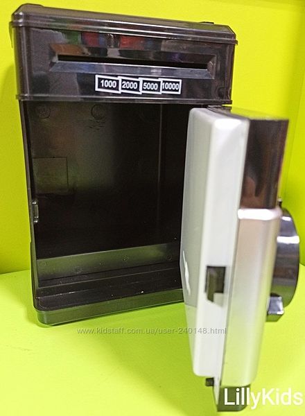 Музыкальная игрушка Сейф банкомат, копилка.Данная копилка-сейф оснащена специальным механизмом, который срабатывает при поднесении купюры к купюроприемнику и затягивает ее внутрь, помещая в основное отделение копилки.