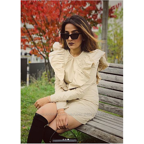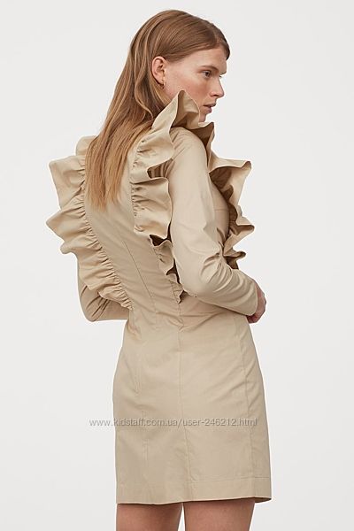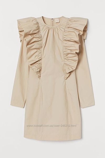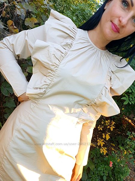 Платье бежевого цвет H&M . Фасон по фигуре прямое , длина мини , но при этом смотрится эффектно.Ткань натуральный хлопок , как будто бы накрахмаленный , поэтому воланы стоят как надо по модели.
