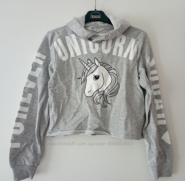 Легкая толстовка H&M с принтом спереди и на рукавах и капюшоном. Длинные рукава с манжетами и открытый закатанный низ. Принт Единорог с блёстками. Размер: 146/152, состав: 100% хлопок. Цена: 635 грн.