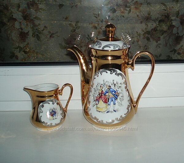 Состояние сервантное, в использовании не был, без сколов и трещин. Лёгкий фарфор, обильная позолота 24 карата, деколь в стиле " галантный век ".В составе 14 предметов: