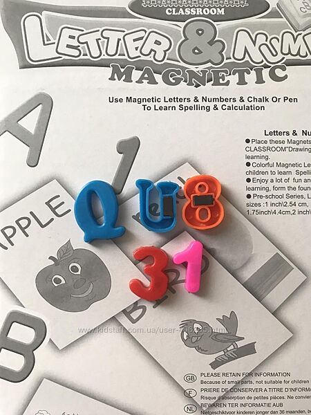 Англійські букви, цифри і знаки на магніті зручно і легко кріпляться на дошку або мольберт, а також вони можуть переміщатися по ній.Діти вивчать алфавіт і навчаться складати склади і слова, вивчать цифри і зможуть складати приклади, також в комплекті йдуть математичні знаки.