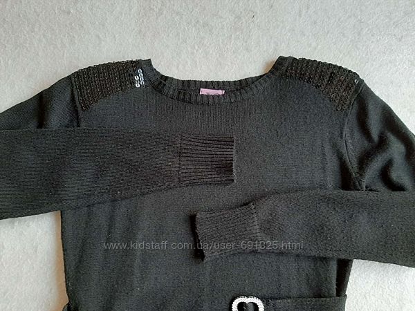 Предлагаю черное вязаное платье для девочки, от F&F. Состав - 100% акрил, на плечах пайетки, есть пояс. Б/у аккуратно, состояние очень хорошее, смотрите фото.Размер указан на 8-9 лет. Длина 68 см, ширина плеч 36+ см, длина рукава 52 см, ширина груди подмышками 38 см, тянется до 46 см.
