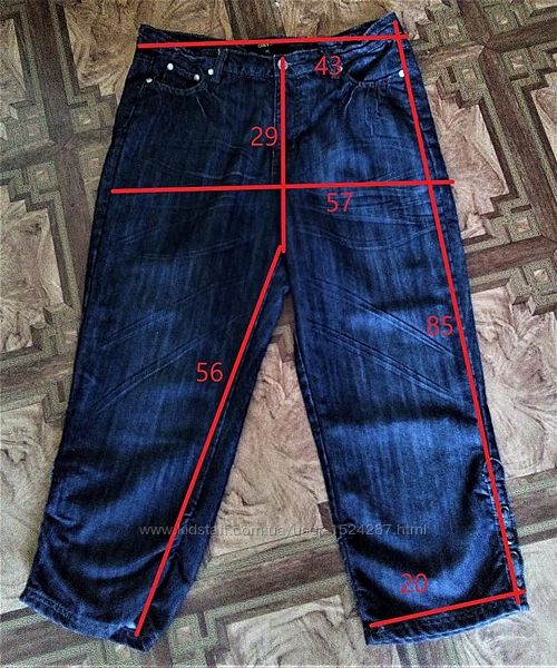 Джинсы укороченные на наш размер 50 ( EU42). По два кармана спереди и сзади закреплены заклепками. Посадка спереди – 29 см, сзади – 40 см. Материал -100% хлопок (не тянутся!). Замеры см. на фото. Самовывоз в Киеве, пересылка по Украине по предоплате на карточку.