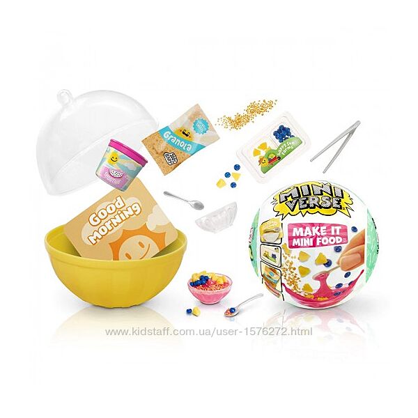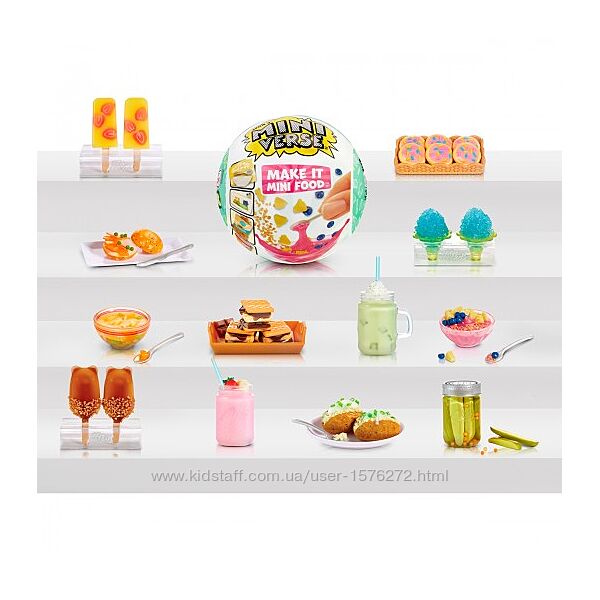 Розпакуйте! Кожна кулька містить реалістичні іграшкові міні´інгредієнти´ та кухонне приладдя для створення власних мініверсій ваших улюблених закусок і десертів! Кожне пакування містить сюрприз, тож ви не дізнаєтесь, який мінінабір у вас є, поки не розпакуєте його!