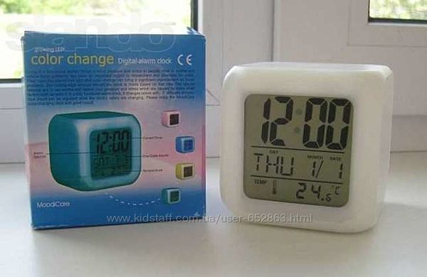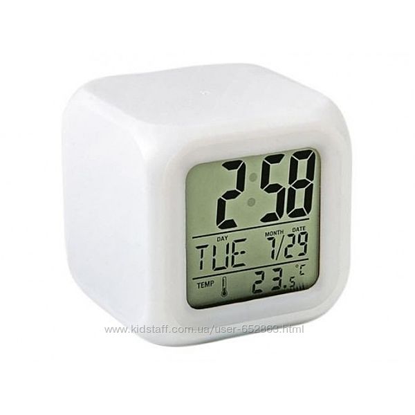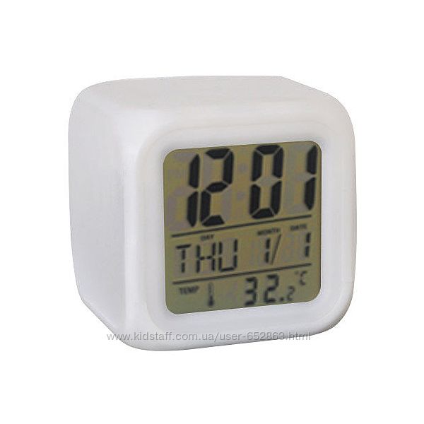 В будильнике помимо функции часов и будильника, есть функция даты, температуры воздуха (в Цельсиях и фаренгейтах), настройки года, а также умопомрачительная подсветка. Подсветка переливается всеми цветами радуги, при переходе минуя тысячи оттенков. Подсветка начинает работать от прикосновения руки. Например, Вы не любите когда ночью что - то мигает, но вдруг Вы проснулись ночью и Вам нужно увидеть время или попить воды, и тут достаточно только дотронуться рукой до будильника и комната озарится приятным цветом, а Вы легко увидите точное время.