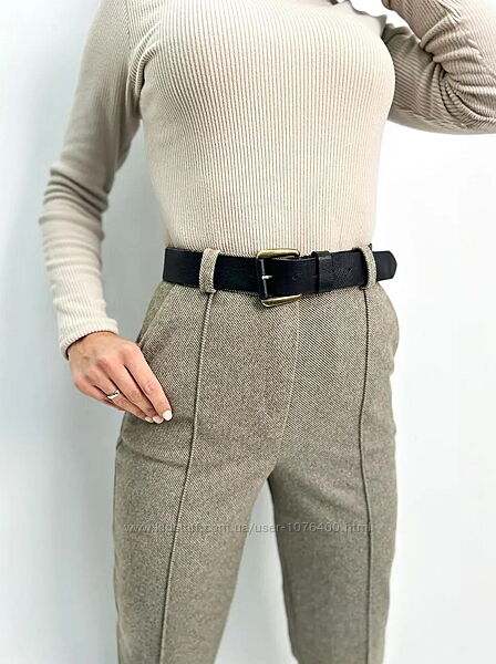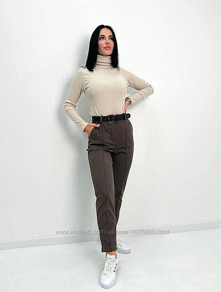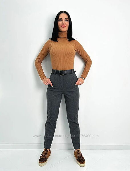 Теплі жіночі штани мають кілька особливостей: - висока посадка; - прямий крій (злегка звужені донизу); - декоративні вертикальні шви-стрілки; - застібка-"блискавка" та гудзик; - матеріал – кашемір з принтом в діагональний рубчик Довжина крокового шва: 73-74 см Довжина бічного шва: 103-106 см