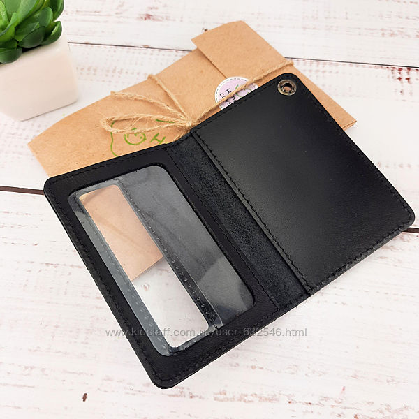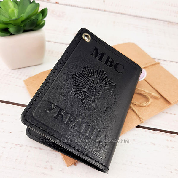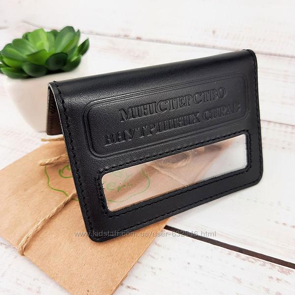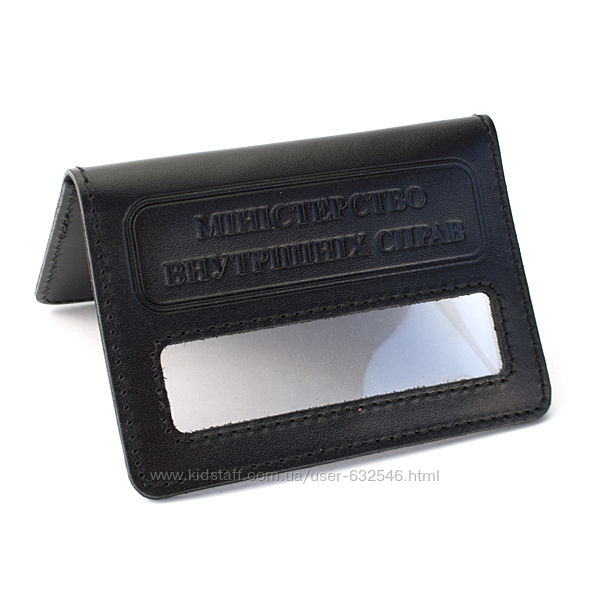 Обкладинка на посвідчення МВС України – це книжка з прозорими кишенями. На лицьовій стороні обкладинки витіснено логотип МВС України. В обкладинці два відділення. Справа - відділ із прозорого міцного пластику для розміщення посвідчення, зліва - непрозора кишеня зі шкіри. Є кільце для кріплення ланцюжка.Обкладинка виготовлена із 100% натуральної щільної шкіри Кайзер.