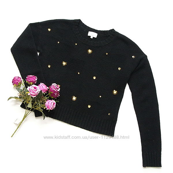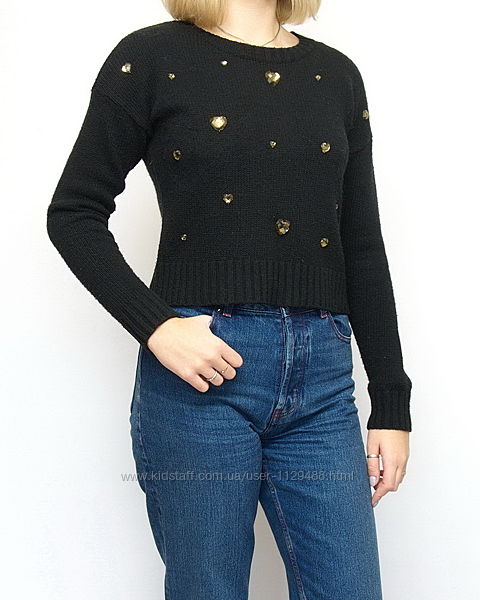 Предлагаю модный укороченный свитер, кроп топ, New Look, Британия.Свитер свободного кроя, гладкой вязки, со спущенным плечом, мягкий, уютный, насыщенного черного цвета, декорирован пришивными выпуклыми сверкающими сердечками разного размера. Смотрится очень эффектно. легко сочетается с любым низом.