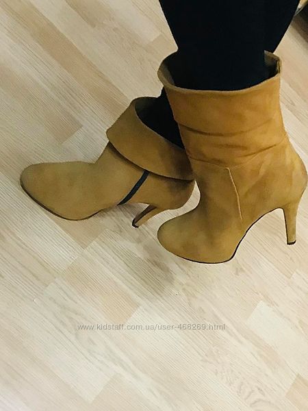 Шикарные модные и стильные полусапожки-ботильоны из натуральной замши снаружи и натуральной кожи внутри+стелька, с тыльной стороны змейка-13см; удобная устойчивая колодка с высоким каблуком; можно носить отвернутыми и с отворотом. На ножке смотрятся элегантно и очень красиво. Бренд Fantasy страна производитель Италия, качество отличноецвет –рыжий