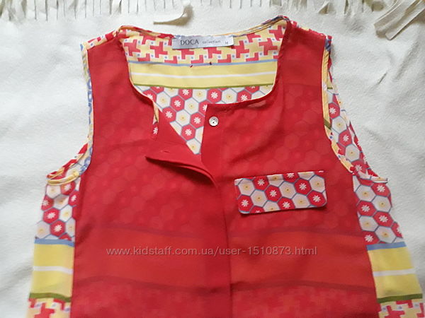 Продам новую женскую шифоновую блузочку марки Doca. Привезена из Франции. Размер М. Блузочка яркая, спереди укороченная и однотонная, сзади чуть длиннее и с принтом. По бокам есть разрезы. Смотрится очень стильно и воздушно! Причина продажи - по ненадобности.Описание и замеры: