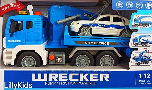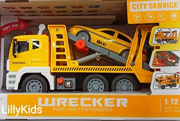 1) Машинка автовоз, трейлер, евакуатор City Service WY832C и WY832A , свет, звук,инерц., масштаб 1:12Прекрасно детализированная модель эвакуатора работает от 3-х батареек AG13, которые обеспечивают звук и свет нашей машины ( батар. в наборе).