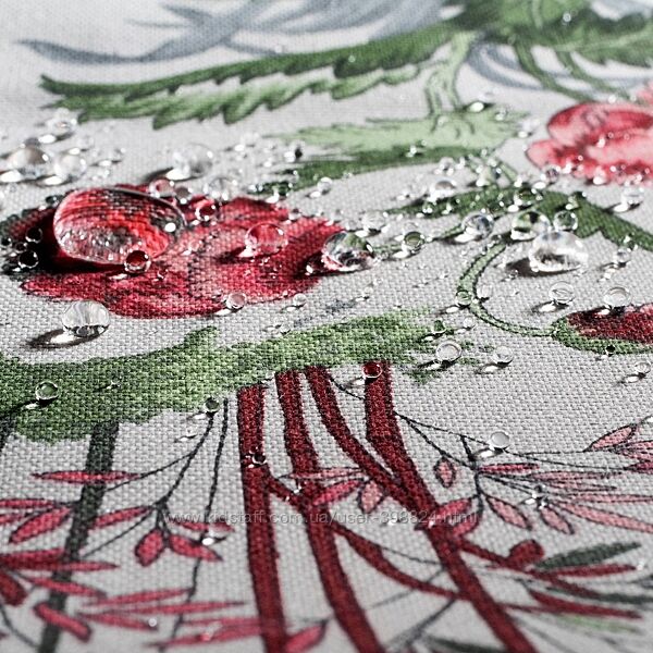 Попавшая на ткань влага просто скатывается капельками, водоотталкивающию ткань можно протереть мягкой ветошью, и она будет сухой. А грязь или пыль с неё можно просто смести или удалить с помощью пылесоса.