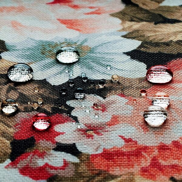 Попавшая на ткань влага просто скатывается капельками, водоотталкивающию ткань можно протереть мягкой ветошью, и она будет сухой. А грязь или пыль с неё можно просто смести или удалить с помощью пылесоса.