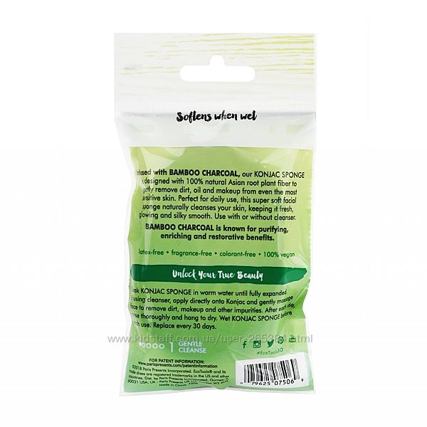 Ecotools Facial Konjac Sponge (7506) создана на основе 100% натуральных волокон азиатских корней растений, которые нежно удаляют грязь, жир и макияж даже с самой чувствительной кожи. Эта сверхмягкая губка для лица, идеально подходящая для ежедневного использования, естественным образом очищает вашу кожу, делая ее свежей, сияющей и шелковистой. Используйте с моющим средством или без него. Бамбуковый уголь известен своими очищающими, обогащающими и восстанавливающими свойствами.Рекомендации по применению: Замочите спонж в теплой воде на 2-3 минуты до полного набухания.