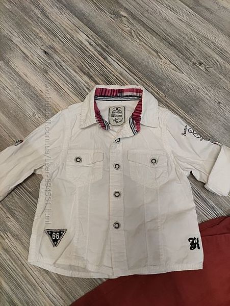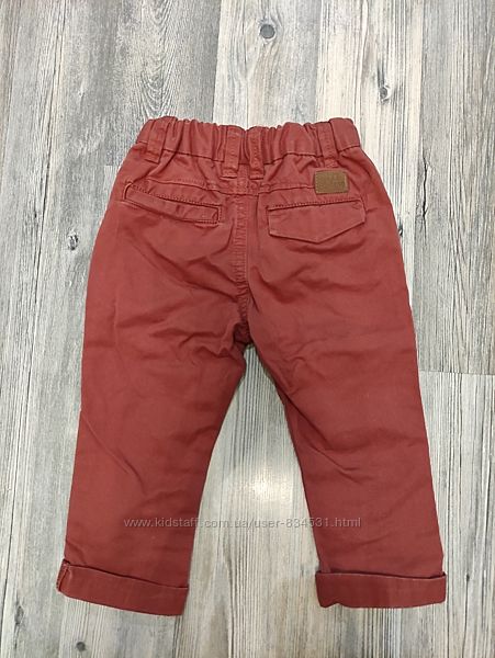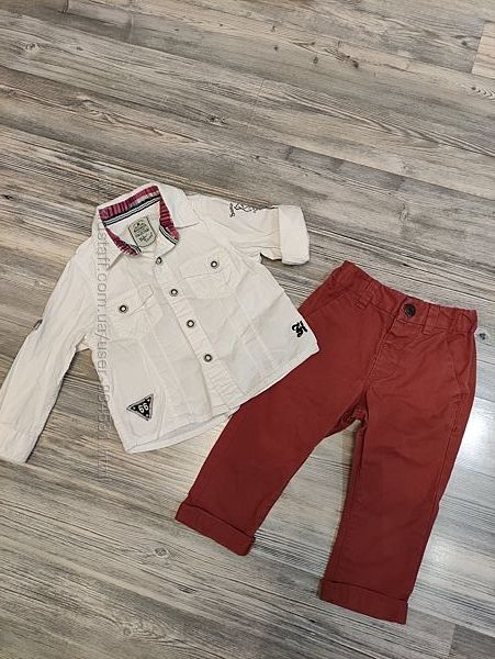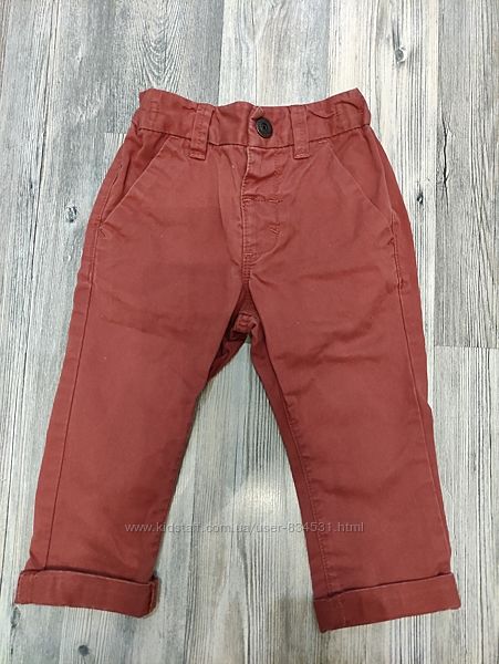 Брючки -джинсы Next красивого кирпичного цвета 9-12мес,большемерят ,сост.новыхдлина 47см,с подворотом 42см,шаговый 31см,пояс 20см,тянется до 25,5см регулировкарубашка 12-18мес Мазеркеа сост.новой