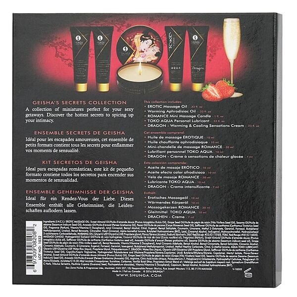 Набор косметики Geisha´s Secret от компании Shunga станет великолепным подарком для яркого романтического вечера. В состав входят лучшие продукты марки - массажные масла, водный лубрикант и даже возбуждающий крем. Аромат клубники и шампанского настроит на получение удовольствия.