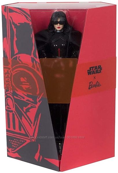 Знаменитый чёрный плащ с капюшоном, облегающее чёрные платье, чёрные сапоги, солнечные очки и красная помада...необычное прочтение Дарта Вейдера от компании Mattel. Эта Барби станет украшением Вашей коллекции!