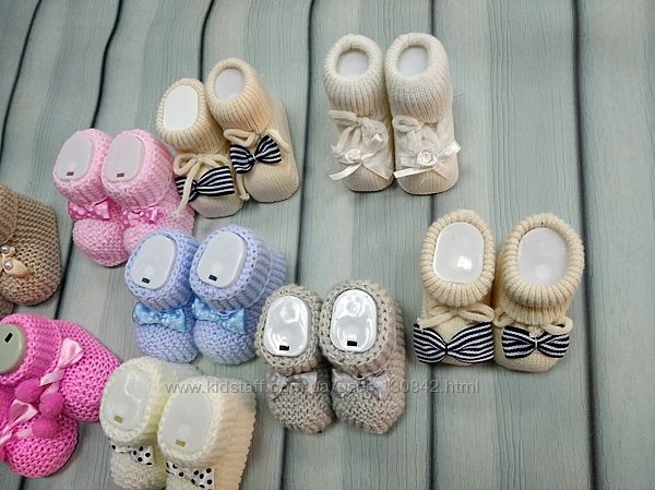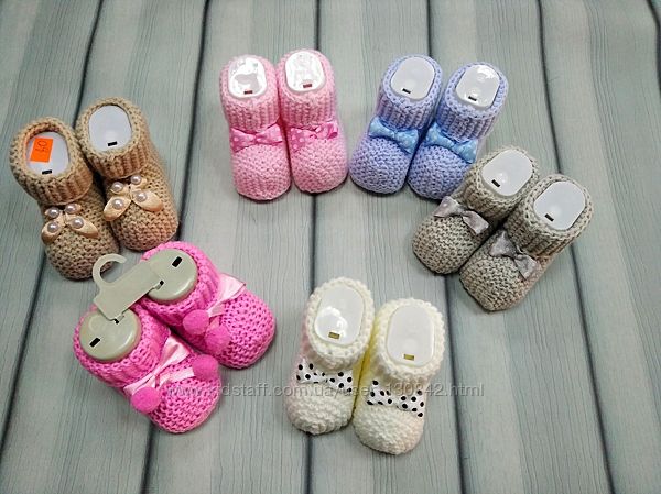 Носки - пинетки вязанные для новорожденныхНоски вязанные для новорожденных.Носки вязанные с прикольным декором спереди. некоторые на завязке спереди для удобства регулировки, чтобы ребёнок не смог снять.