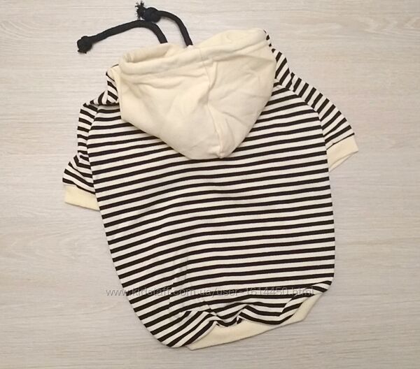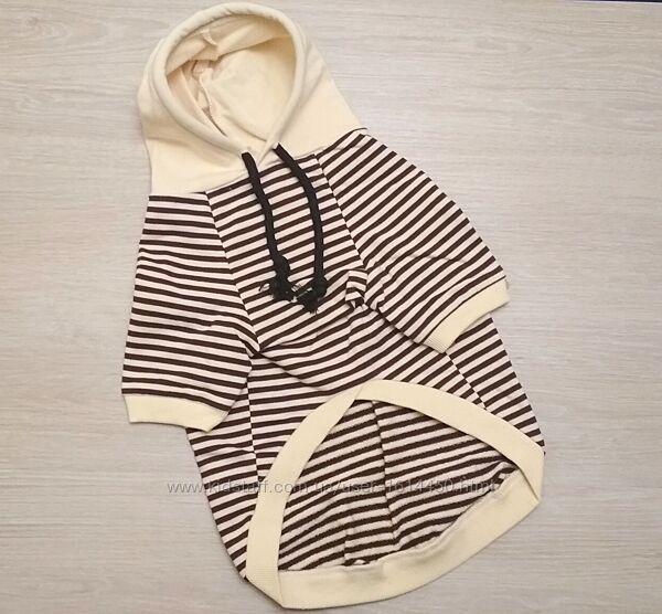 Реглан в полоску с капюшоном для кабачков и булочек. Хлопок 100%! Стильный, очень качественный, приятный на ощупь, хорошо тянется, простой и удобный! Отлично подойдёт для французского бульдога, мопса. В наличии цвета - кремовый в коричневую полоску, кремовый в черную полоску. Сезон - весна, лето, осень.