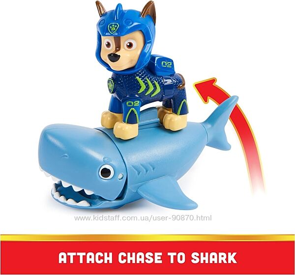 ДРУГ=АКУЛА: настав час для ще одного неймовірного порятунку з Чейзом і його друзякою акулою! Прикріпіть Чейза до спини Акули та перекотіть Акулу вперед, щоб активувати її жування, як укус акули!