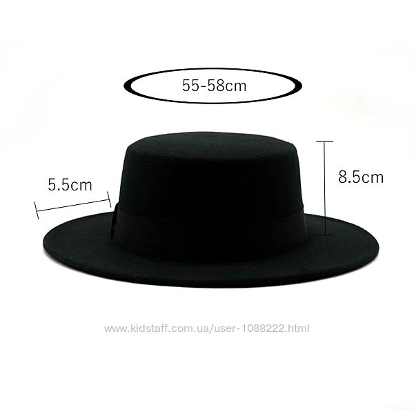 Жіночий фетровий капелюх канотьє зі стійкими полями в чорному кольорі. Ширина полів 5,5 см.Розмір універсальний 54-57 см, регулюється тасьмою всередині.