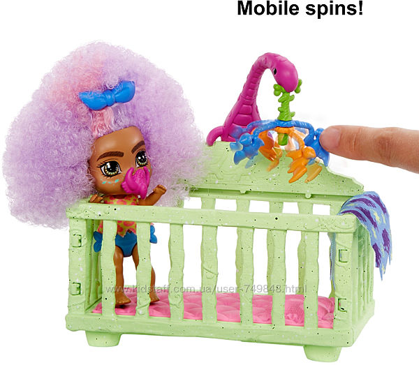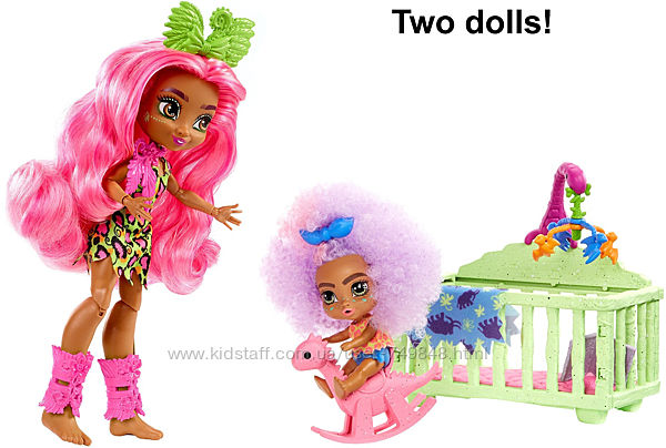 Оригинал. Куплен в Америке.С куклами и игровыми наборами Cave Club дети могут путешествовать во времени и открывать для себя эпические приключения со своими любимыми доисторическими персонажами, такими как Фернесса, первая няня! У куклы Фернесса есть все, что ей нужно, чтобы присматривать за детьми, в том числе кроватка с очаровательным мобилем, который вращается, чтобы зажечь сладкие сны. Когда время сна закончится, посадите малышку Фурру на качалку лошадь-динозавр и подтолкните ее, чтобы она покачивалась. Маленькие аксессуары позволяют детям разыграть все, от перекуса до рассказа, а две куклы в ярких неоновых тонах вдохновляют на рассказывание историй.