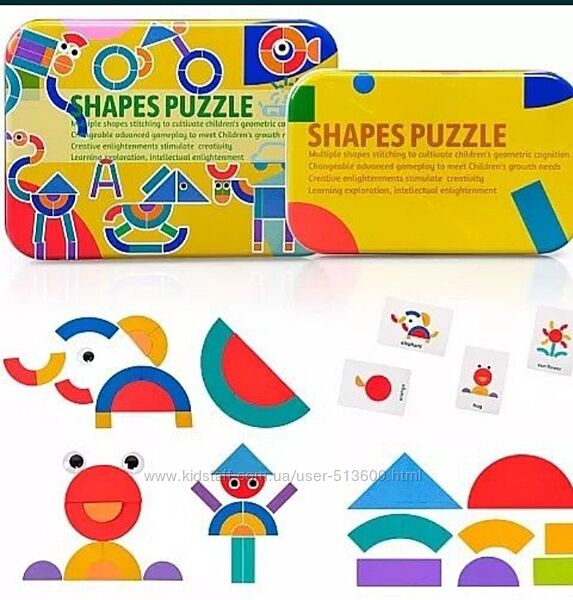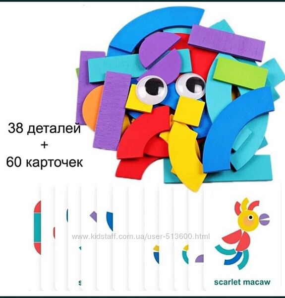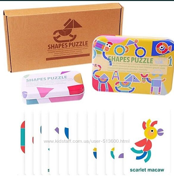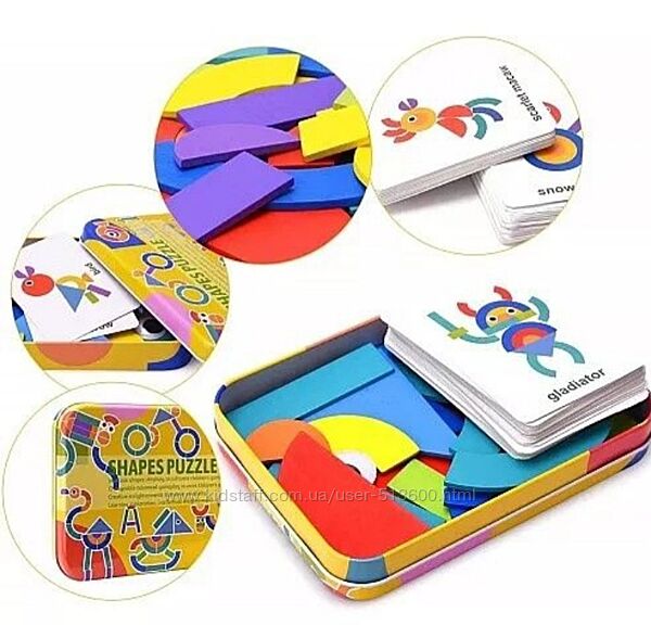 Деревянная 3 -Д мозаика, которая состоит из набора деталей в виде различных геометрических форм и карточек с заданиями. Из набора деталей можно выложить и животное, и машинку, и птицу, и всякое разное. Такое разнообразие картинок надолго займет внимание Вашего ребенка. В комплекте 34 деревянные детали и 60 двухсторонних карточек-заданий( всего 120 заданий). Детали и карточки упакованы в отдельные металлические коробочки , а сами коробочки в картонную упаковку.