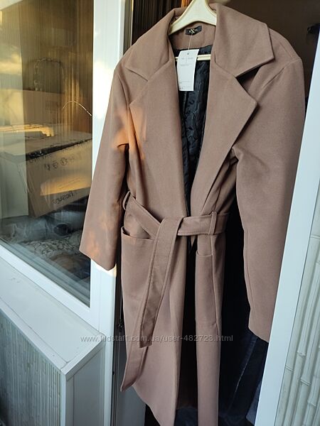 Пальто женское демисезонное. С подкладкой, утеплённое ватином. Размер универсальный 42-46. Турецкий кашемир. Цвет мокко. Пальто на запах под пояс. По бокам действующие карманы. Качество отличное.Длина 100 см, ширина в груди 50 см, длина рукава от плеча 62 см, ширина плеч 42 см, ширина в бёдрах 50 см.