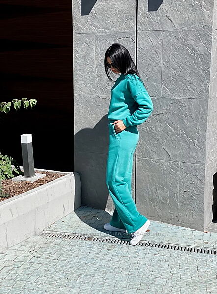 Характеристики Сезон. Весна - осінь - зима Розміри: 42-44, 44-46 Ткань: Тринитка на флісі Колір: чорний, блакитний, фрізовий, зелений Орієнтовні виміри: *42-44 - Кофта Напівобхват грудей - 55 см Довжина від плеча – 68 см Рукав за внутрішнім швом - 47 см - Штани Напівобхват резинки - 31 см Напівобхват стегон - 45 см Довжина від резинки – 103 см Довжина по внутрішньому шву - 74 см *44-46 - Кофта Напівобхват грудей - 55,5 см Довжина від плеча-71 см Рукав за внутрішнім швом - 47 см - Штани Напівобхват резинки - 32 см Напівобхват стегон - 49 см Довжина від резинки – 106,5 см Довжина по внутрішньому шву - 75 см