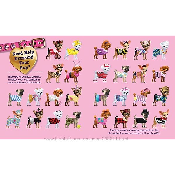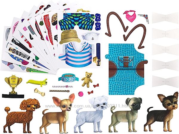Поставляется с 5 прочными бумажными щенками - йорком, чихуахуа, мальтийцем, пуделем и мопсом. В их потрясающих гардеробах есть зимняя и летняя одежда, пижамы, дождевики и даже бикини. Эти драгоценные щенки с более чем тридцатью двусторонними моделями будут хорошо выглядеть с головы до пят. В отличие от обычных нарядов для бумажных кукол, эта одежда надежно удерживается на месте и выглядит так же стильно сзади, как и спереди.