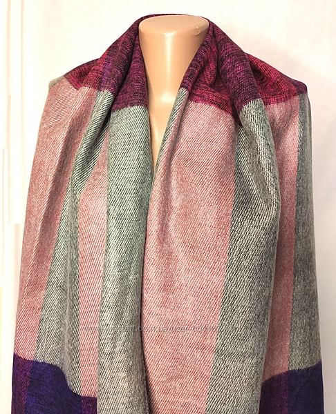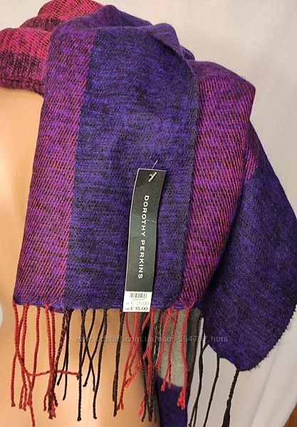 Шарф палантин Dorothy PerkinsОчень теплый, лёгкий, приятный на ощупь тканый женский шарф от известного бренда, 100% акрил. Можно использовать как головной убор, накидку на плечи или шарф. С кисточками на краях. Основной цвет комбинированный - фиолетовый (пурпурный) с серым.
