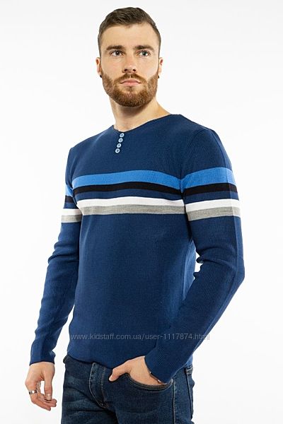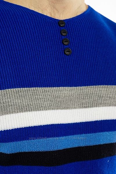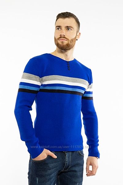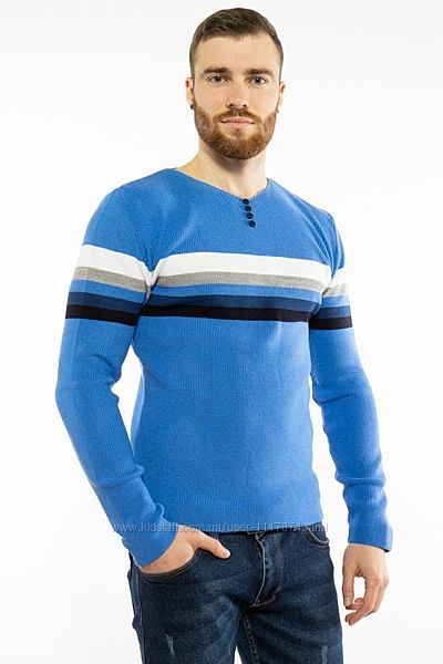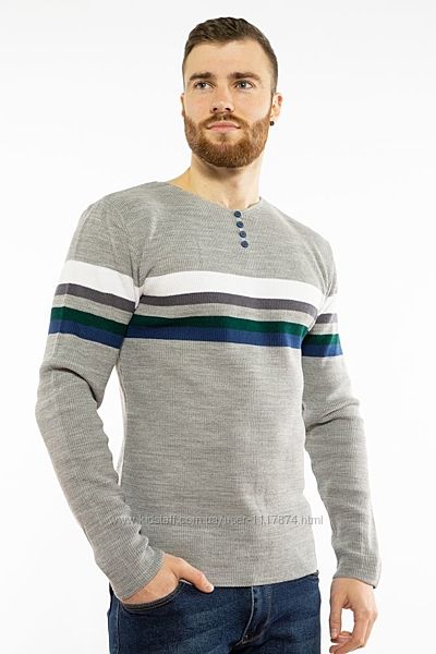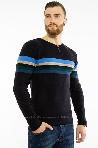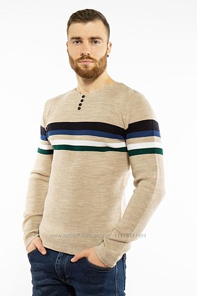 Оригінальний, чоловічий в´язаний светр, виконаний з пряжі, до складу якої входить натуральна вовна та акрил, завдяки чому забезпечується тепло та комфорт у поєднанні з невибагливістю у догляді. Декоративне оформлення виробу полягає в наявності широких, різнокольорових смуг по грудях і рукавах в області плечей, а також невеликих гудзиків, що імітують застібку V-подібної горловини.