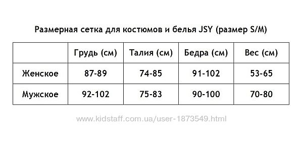 S/M - грудь: 87-89 см, талия: 74-85 см, бедра: 91-102 см, вес: 53-65 см