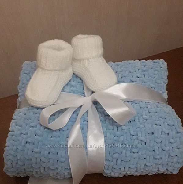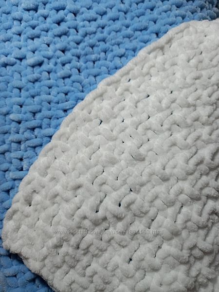 Очень нежный, мягкий плюшевый плед для малыша в кроватку или в коляску. Связан вручную из плюшевой пряжи. (Состав 100% микрополиэстер)Размер 80 см * 85 см