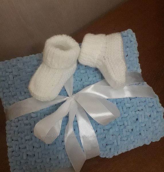 Цвет нежно голубой. В комплекте белые пинетки (100% акрил) для новорожденного (длина стельки 8-9 см)