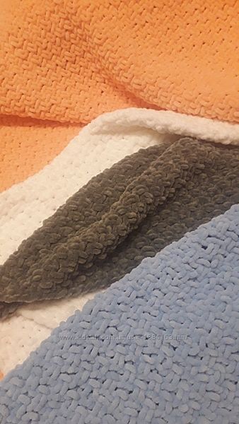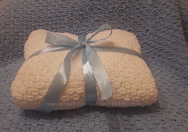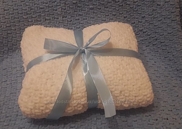 Очень нежный, мягкий плюшевый плед для малыша в кроватку или в коляску. Связан вручную из плюшевой пряжи. (Состав 100% микрополиэстер)Размер 85 см * 100 см
